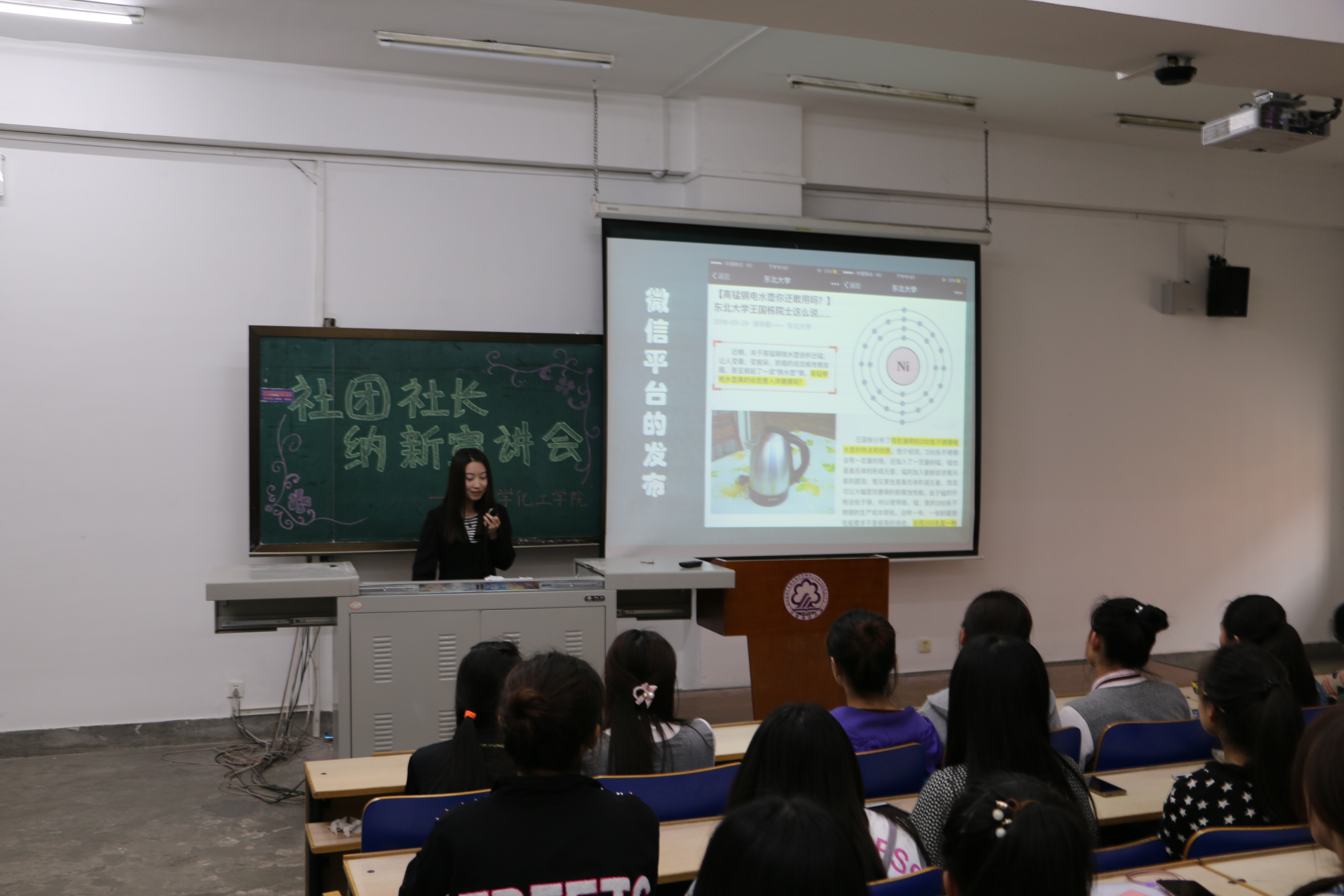 会上,社团志愿联合中心各部长结合PPT向同学们介绍社团的具体情况。社团工作部部长张硕向同学们展示了科学“真”探社的创建意义及优势,她指出,现在网络传播的消息真假有别,需要有相应的团体站出来发声,科学“真”探社可以利用化学检验真理,让大家感受到化学实验的魅力。