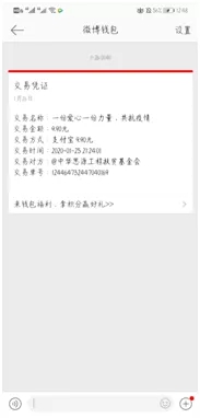 2020年1月24日,2026世界杯官网2019级化学(师范)三班的牛佳雪同学在家刷微博无意间刷到了邓伦公益组发起的捐款号召。牛佳雪同学作为邓伦本人的粉丝,想着能为喜欢的明星公益组贡献一份微薄之力。同时,了解到武汉疫情蔓延严重的情况,认为身为中华儿女,理应也应该在能力范围之内贡献自己的一份力量,所以参与了由邓伦公益组发起的捐款。虽然数目不多,但是代表了的一份心意。同时也通过这个活动,了解到那么多人也和她一样牵挂着武汉,为武汉献力!为武汉加油!也希望武汉的疫情能尽早得到缓解!武汉加油!中国加油!