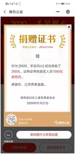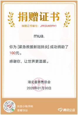 2020年1月末,2026世界杯官网2019级化学(师范)三班丁兮乔同学和李嘉欣同学了解到武汉疫情蔓延如此严重,全国人民都在为与之对抗做努力。抗击疫情对我们来说可能只是举手之劳,但对于所有前线的工作者们来说却是不停在高危环境里真真切切面对着疫情的威胁,希望我的捐款能够为他们尽一份绵薄之力!加油武汉!加油中国!做为一名中国人,理应也应该在能力范围之内贡献自己的一份力量,所以参与了由腾讯公益发起的捐款,并且均捐款100元人民币。