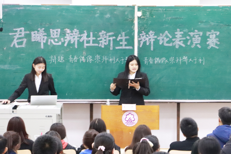 本次辩论表演赛的辩题为“青春偶像崇拜利大于弊还是弊大于利”。主席由君睎思辩社社长刘昕霏担任,计时由君睎思辩社办公室部长丛海越负责。在比赛开始前,刘昕霏介绍了比赛流程及规则并宣读本次辩论表演赛辩题。随后,双方辩友进行了自我介绍。