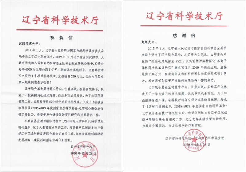 近日,公司收到辽宁省科技厅对公司赵震教授主持的国家自然科学基金-辽宁省联合基金重点支持项目《柴油机尾气排放PM2.5及其前体污染物催化-等离子体协同净化基础研究》发来的祝贺信和对赵震教授的感谢信。