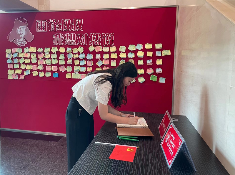 在活动的最后,党员同志们在雷锋留言板处写下了此行的感悟,并在雷锋雕塑前重温了《雷锋日记》,在回到学校后支部成员们积极的开展了志愿服务活动。