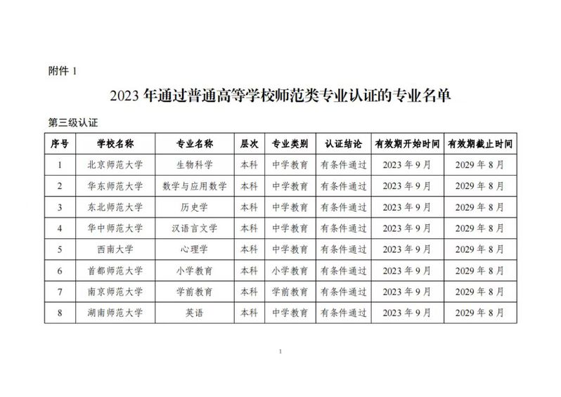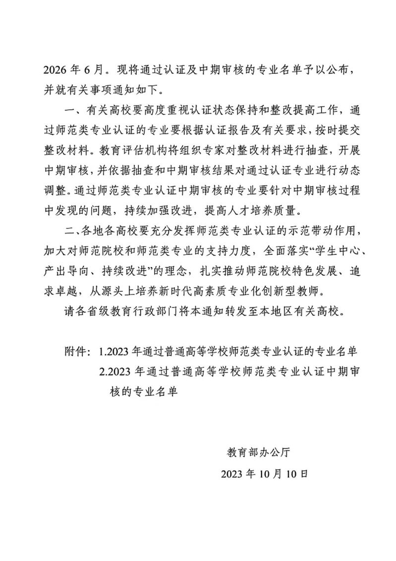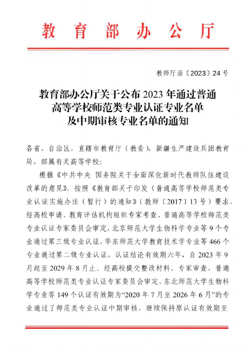 日前,教育部印发《教育部办公厅关于公布2023年通过普通高等学校师范类专业认证专业名单及中期审核专业名单的通知》(教师厅函〔2023〕24号),公布了2023年通过普通高等学校师范类专业认证及中期审核的专业名单。公司化学(师范)通过中学教育第二级认证,认证结论有效期六年,自2023年9月起至2029年8月止。