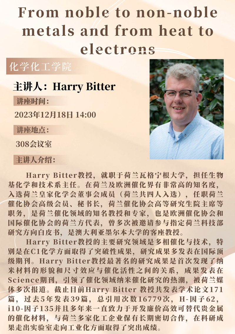 Harry Bitter教授学术报告预告:From noble to non-noble metals and from heat to electrons