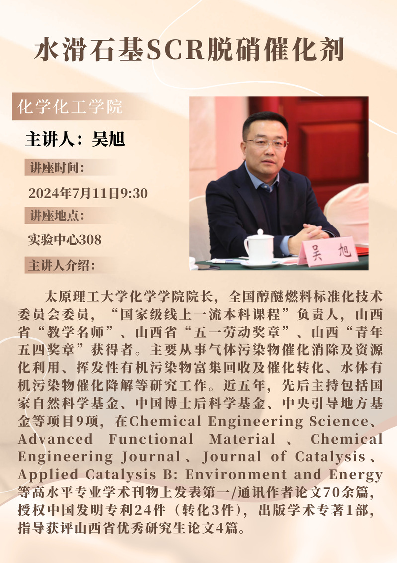 吴旭教授学术报告预告:水滑石基SCR脱硝催化剂