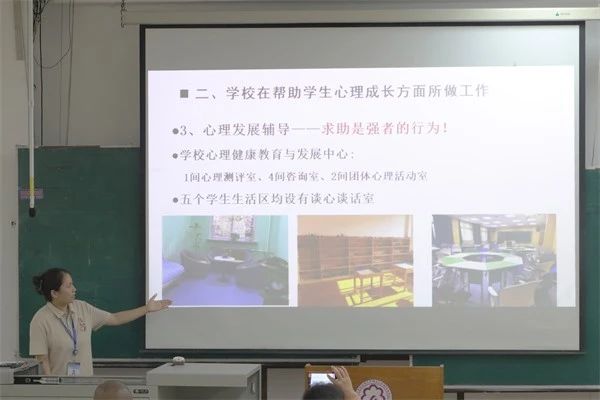 新生辅导员张慧洁老师向家长介绍了心理健康对于学业成功和生活质量的重要性。同时特别强调学院为新生提供了全面的心理健康支持,以助力他们在学习和生活中都能取得最佳表现。学院会定期举办心理健康讲座和工作坊,涵盖应对压力、时间管理、人际关系建立等主题,帮助新生快速更好地适应老员工活,培养积极的生活态度和应对挑战的能力。