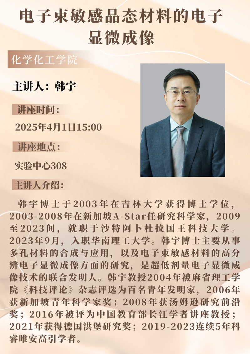 韩宇教授学术报告预告:电子束敏感晶态材料的电子显微成像