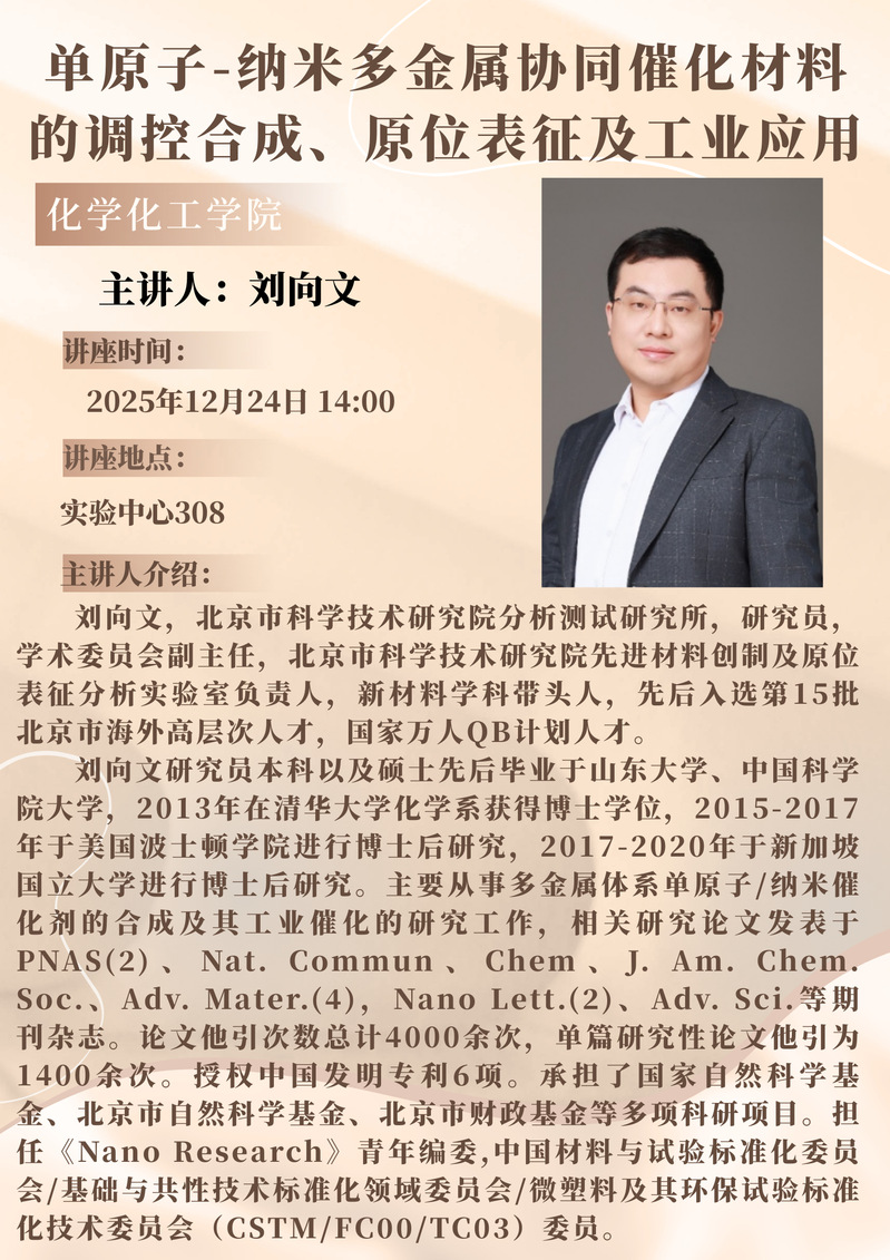 刘向文研究员学术报告预告:单原子-纳米多金属协同催化材料的调控合成、原位表征及工业应用