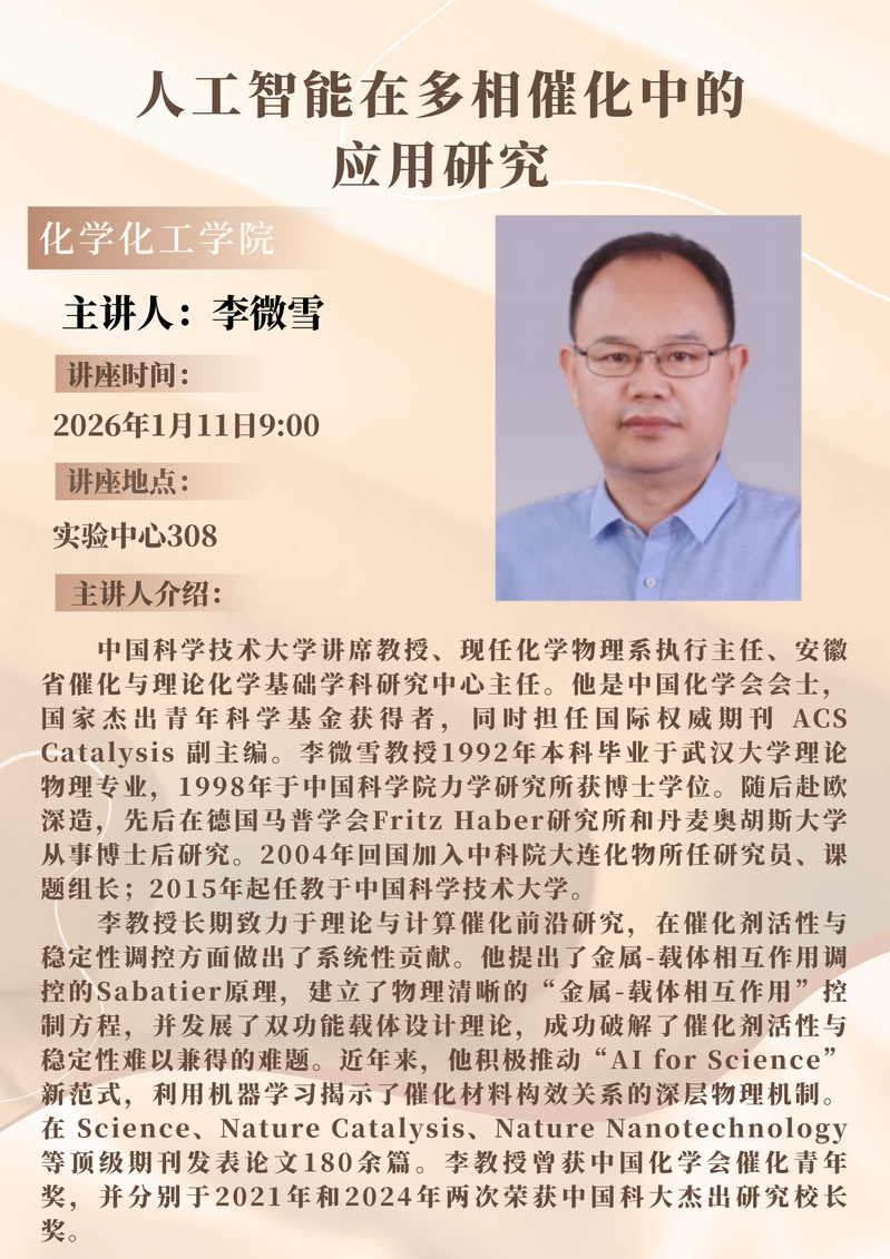 李微雪教授学术报告预告:人工智能在多相催化中的应用研究